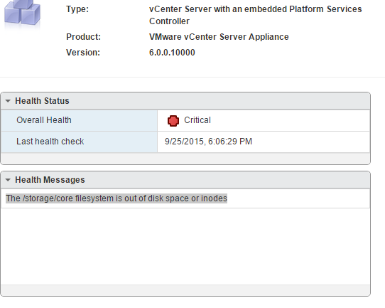 As you can see below the coredumps is full. I found a useful article here which then link to this great article. After installing or upgrading an external psc of vcenter server 6 5 the storage core directory is continuously filled to 100. November 15 2019 recently we have upgraded the vcsa after that noticed some performance issue while loading vcenter inventory.